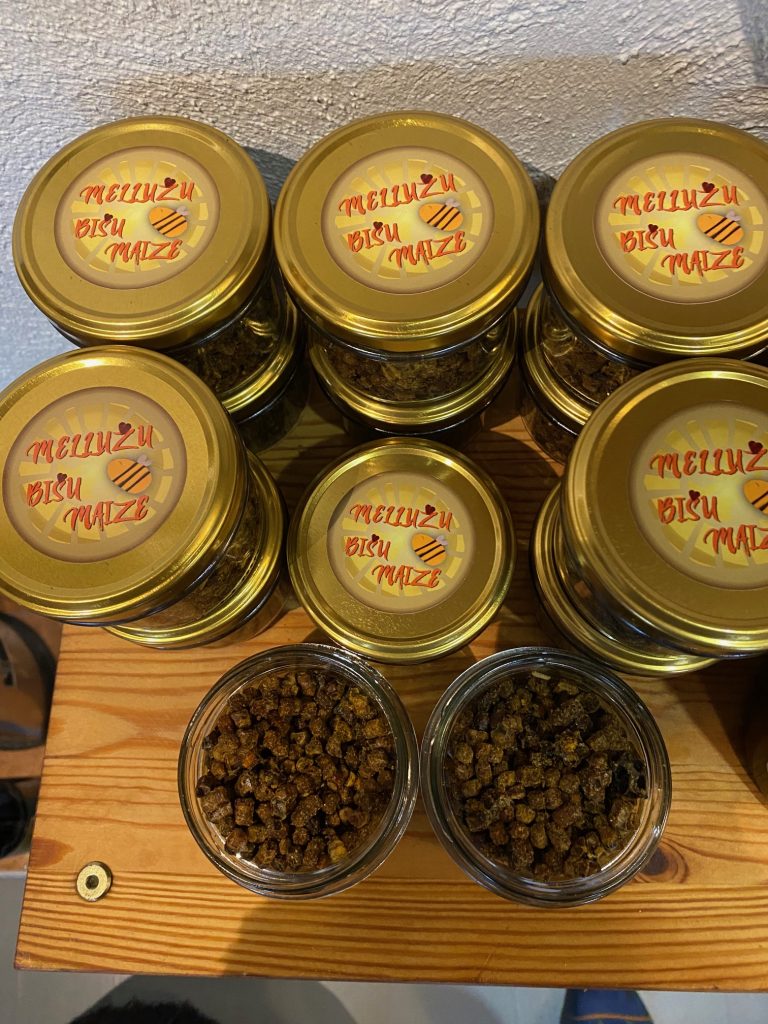 Šogad bija tikai pavasara medus, atlikušajā vasaras daļā bites nelielo ienesumu un neneizlietotās ziemas barības rezerves pilnībā noēda un augustā jau bija jāsāk piebarot. Kopumā šogad izbaroju ap 350 kg cukura – labi, ka šogad cenas nelido virs eiro kilogramā. Redzēs kāda būs ziema, ka tik pavasarī nevajadzēs vēl. Bet savā ziņā atvieglojoši, ka šovasar nevajadzēja ļoti noslogot medus sviešanas konveijeru – vēl ir atlikumi no pagājušā gada rekordražas. Medus nebojājas – sausumā tas var stāvēt 1000 gadus nezaudējot kvalitāti. Sausums, jeb mitruma procents medū tagad, kad ir iegādāts mitruma nosūcējs lielas problēmas nesagādā, tomēr šad tad gadās, ka kāda burciņa uzrūgst. Ja tāda nokļuvusi pie jums – samainīšu bez maksas. Pagājušogad uzrūga diezgan daudz viršu medus, to ir daudz grūtāk žāvēt, tā karameliskā struktūra nelaiž ūdeni ārā, vajag vairāk laika. Bet šogad viršu medus nav, tā ka tie ir nākamo gadu kreņķi.