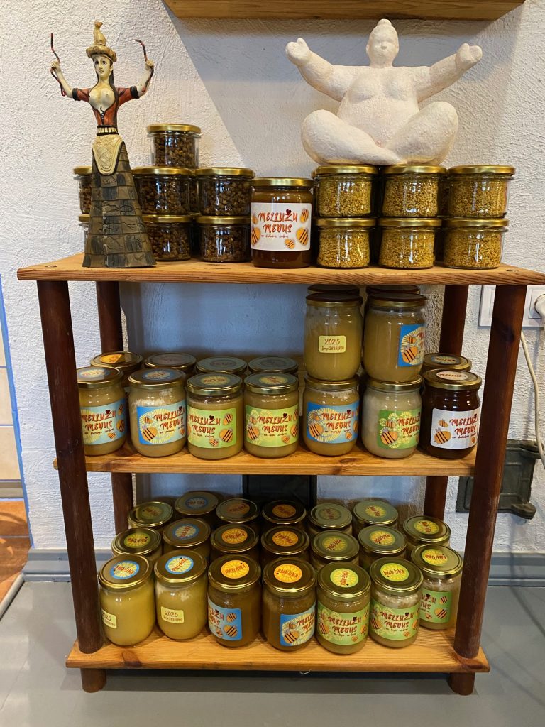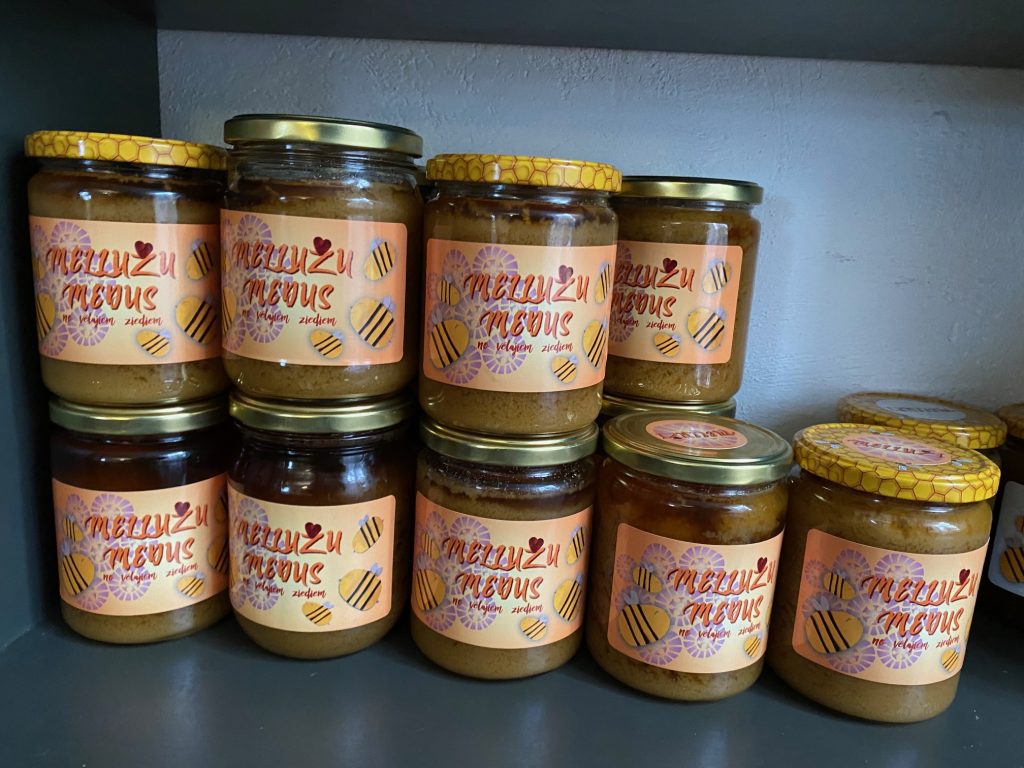 Man bites ir gan pamatnovietnē Mellužos, gan pie znotiem Ikšķilē un Raganā, attiecīgi arī medus. Augustā vedu bites uz Ģipku – uz viršiem. Par to, no kuras novietnes medus nācis, liecina uzlīme uz vāciņa, bet uz burciņām visur tikai brenda nosaukums – Mellužu medus. Pavasara (līdz Jāņiem vāktais) medus ir ar zilām etiķetēm, liepu (jūlijā) – ar zaļām, vēlo ziedu (augustā) – ar oranžām, visas vasaras (kas krāts visu vasaru peru telpās, lejā) – gaišpelēkām un viršu – ar violetām. Vēl viena medus šķirne ir viršu medus, kas ienests Mellužu un Ikšķiles saimju peru telpās un kuru spiežam kopā ar bišu maizi, kas ir blakus šūnās. Sanāk produkts, kas jāēd ar karoti no burciņas, nevis liekot uz maizes vai siera kā „normālais” medus.